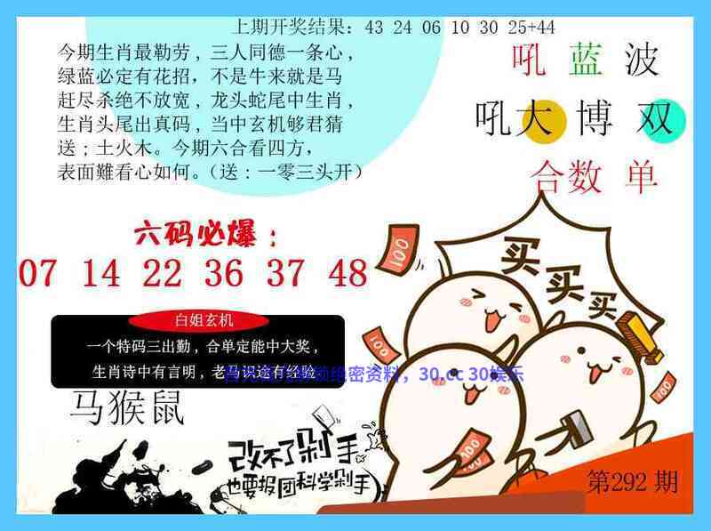 292期:复式连肖(马猴猪狗龙牛羊)中3个 |